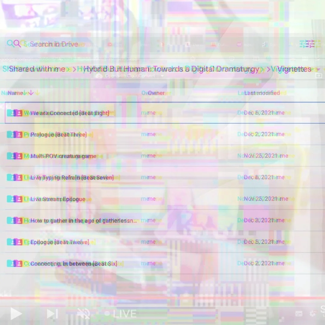 Hybrid but Human: toward a digital dramaturgy is a meditation on gathering, intimacy and making live performance work in the age of digitality. The telematic performance is a result of an experimental online process between Shameelah Khan (JHB), Geoffrey Diver (MP), and myself (CPT) in November of 2021.